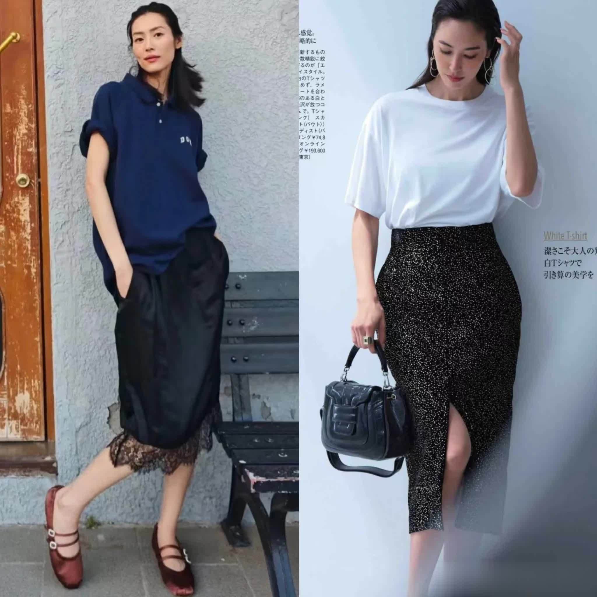 简单的白T搭配黑色直筒裙,风格偏休闲一些,也很有精致女人味。