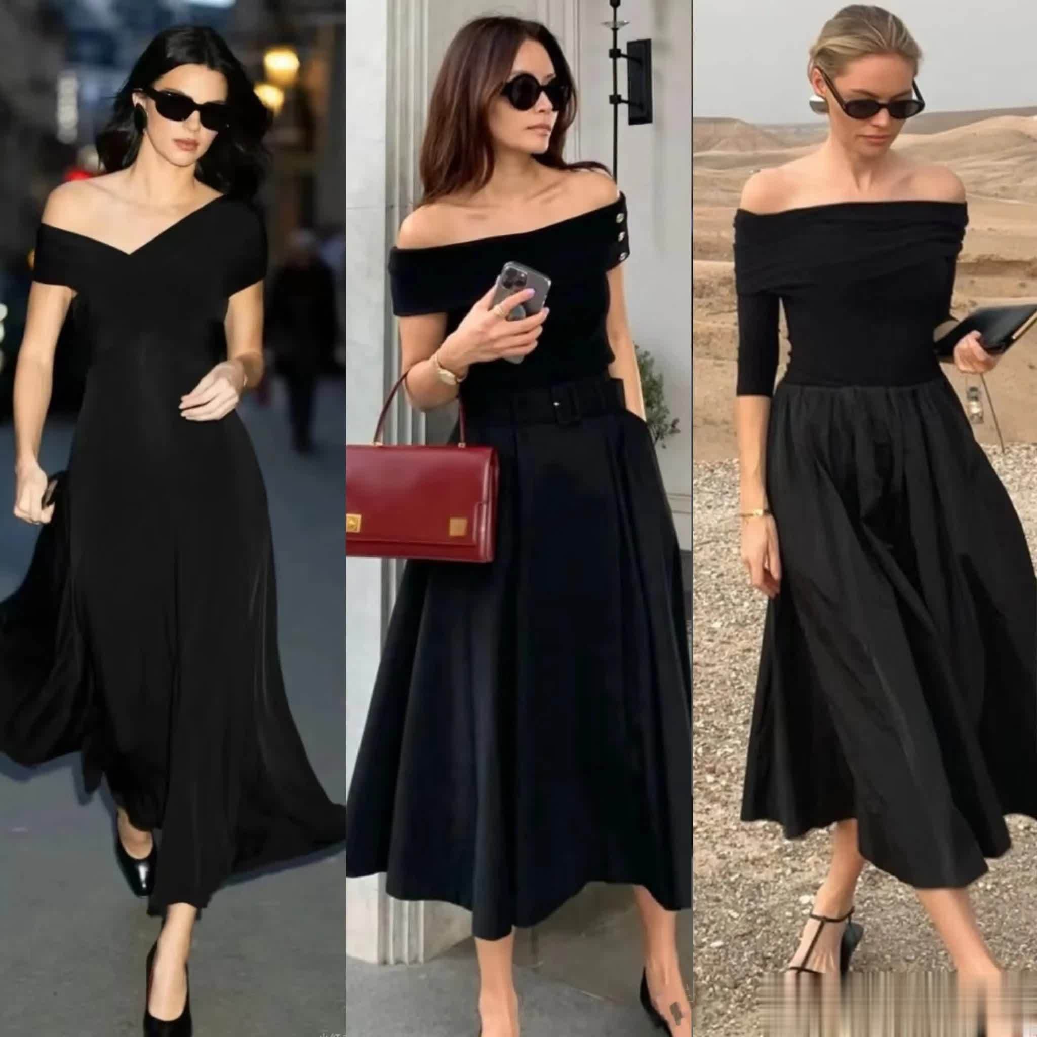 露肩的赫本风小黑裙简直太经典了,它一字领的设计可以穿出漂亮的天鹅颈,露出香肩则多了一份优雅与性感,宽宽的裙摆随风轻摆会很灵动飘逸,女人味十足。