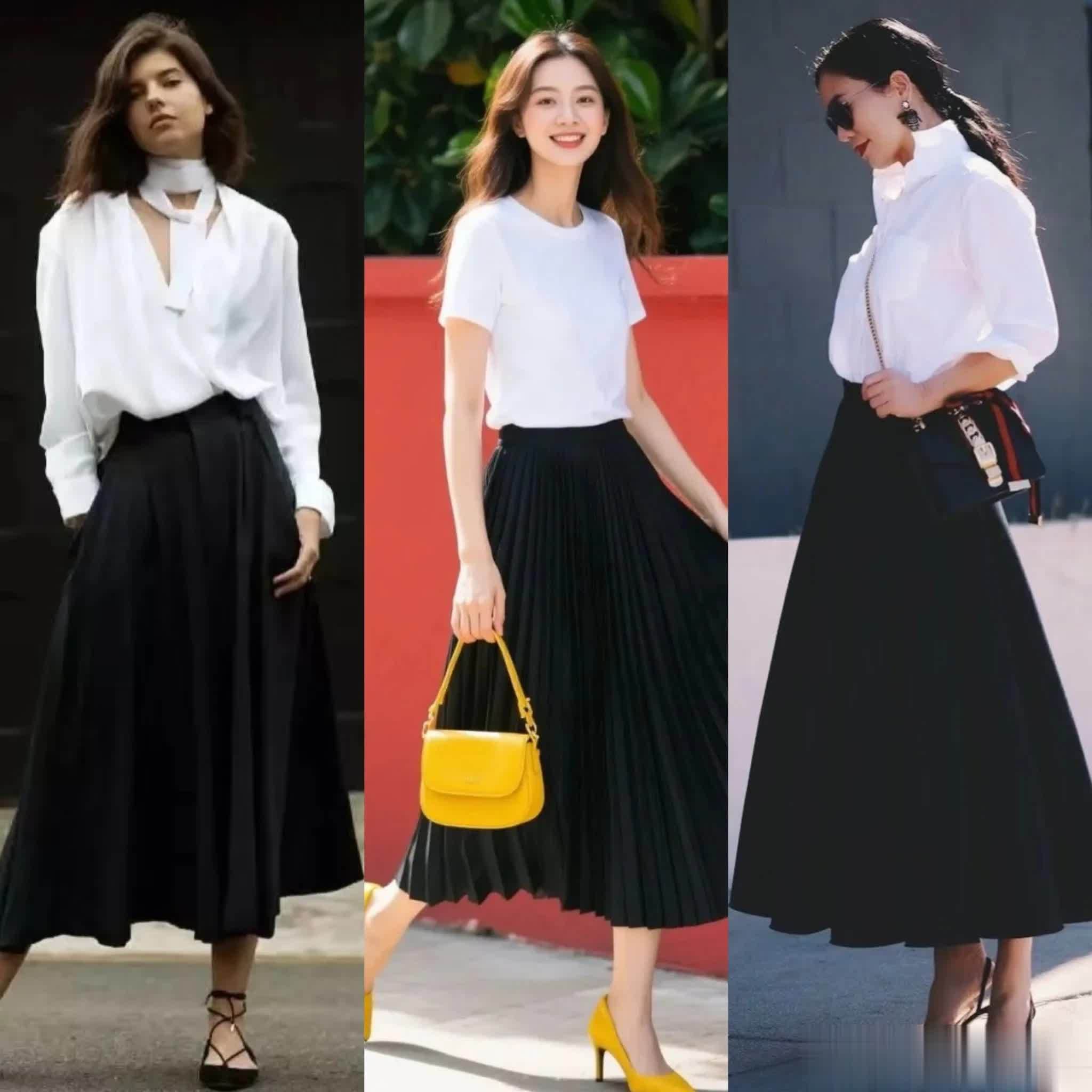 白色衬衫搭配黑色赫本裙,经典的黑白配永远都不会过时,又有一种简洁知性的气质,带着利落感,特别适合上班穿。