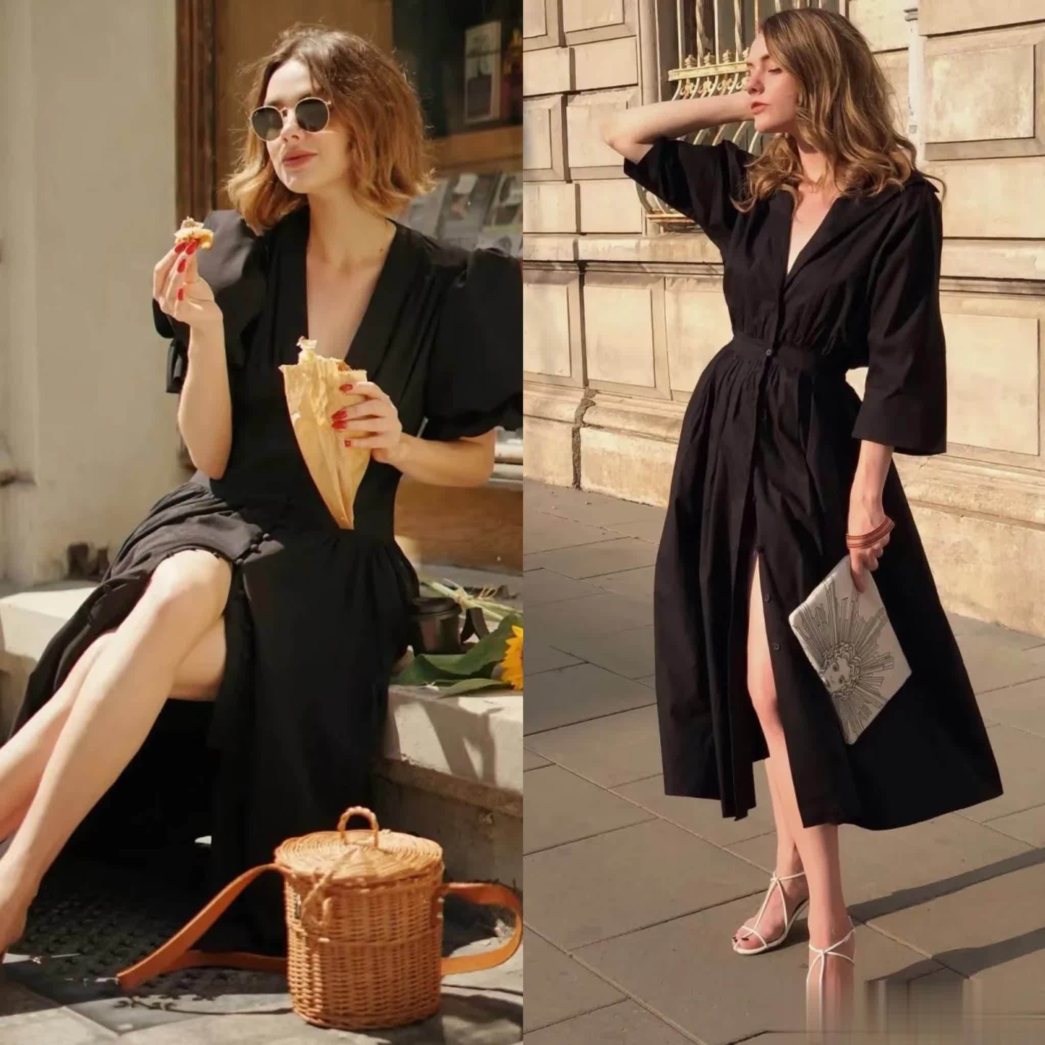 深V领的黑色衬衫裙,选择轻盈的雪纺或是亚麻材质,穿起来更飘逸浪漫,又不失高级感。