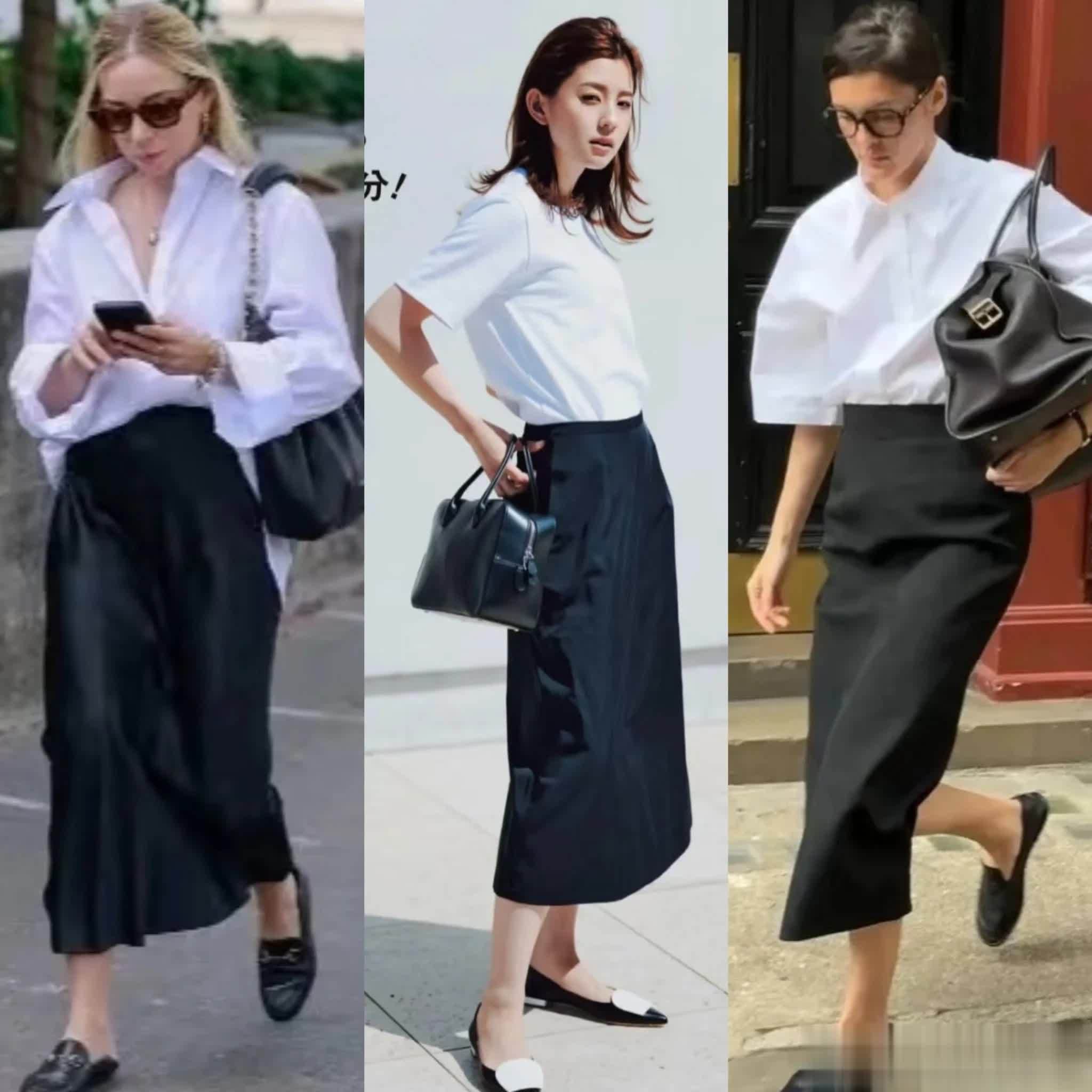 夏天,一件白色的廓形衬衫搭配黑色直筒长裙,简洁干练的职场“女boss”气场,给人一种强大的气场感,配上乐福鞋,增加了精致又随性的感觉,适合日常通勤。